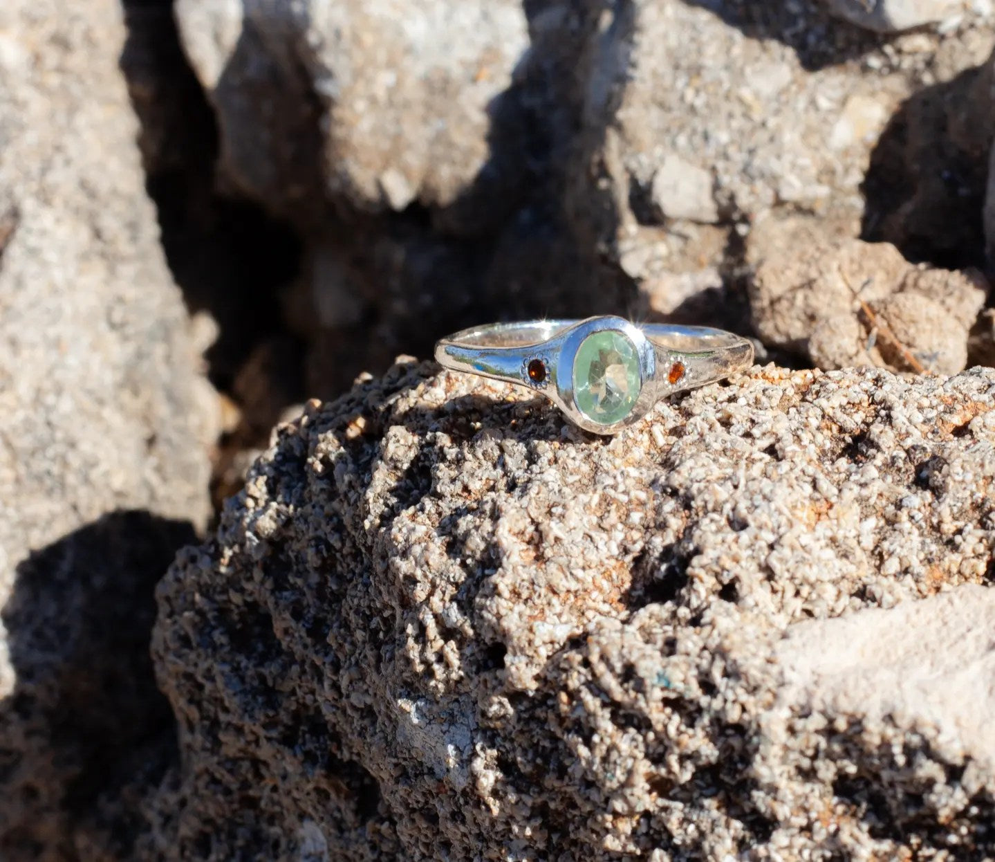 - שיבוץ של טורמלין טבעית בגוון מנטה מבריק אליו מתלווים בכל צד סיטרין טבעית המשובצים בצורת פרח.
