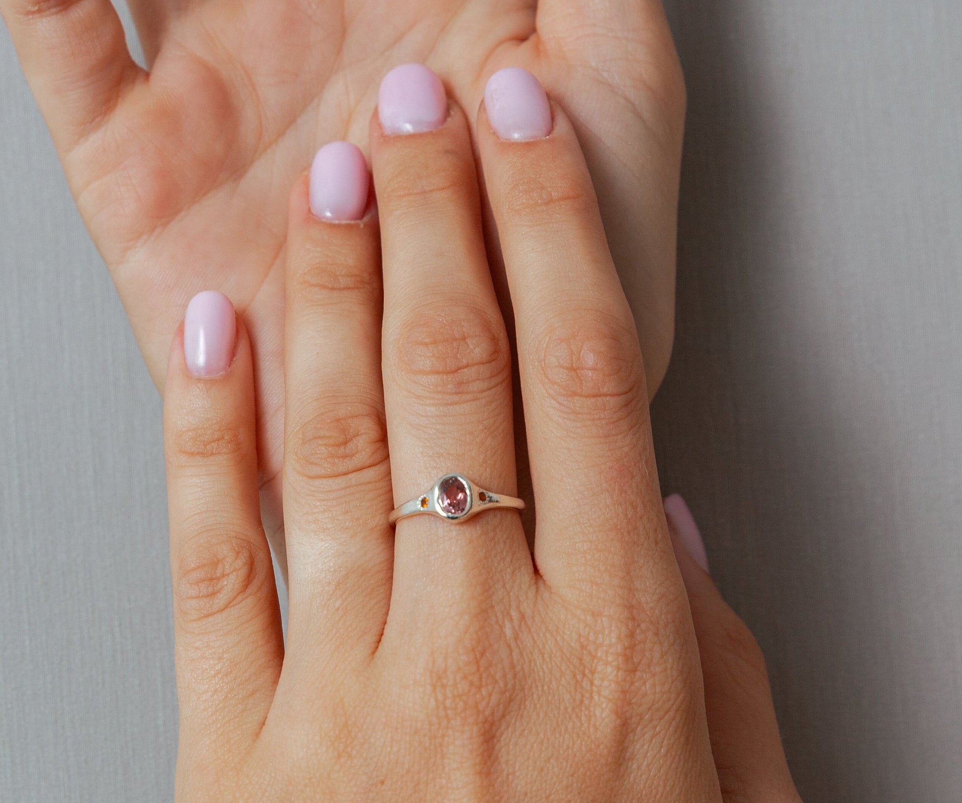 טבעת גבוהה הנעשית בעבודת יד מכסף 925, בעלת שיבוץ מרכזי של טורמלין ורודה על גוון האפרסק טבעית בעלת צבע יחודי ובצדדים משובצות סיטרין מדרה מכל צד בשיבוץ פרחים עדינים.