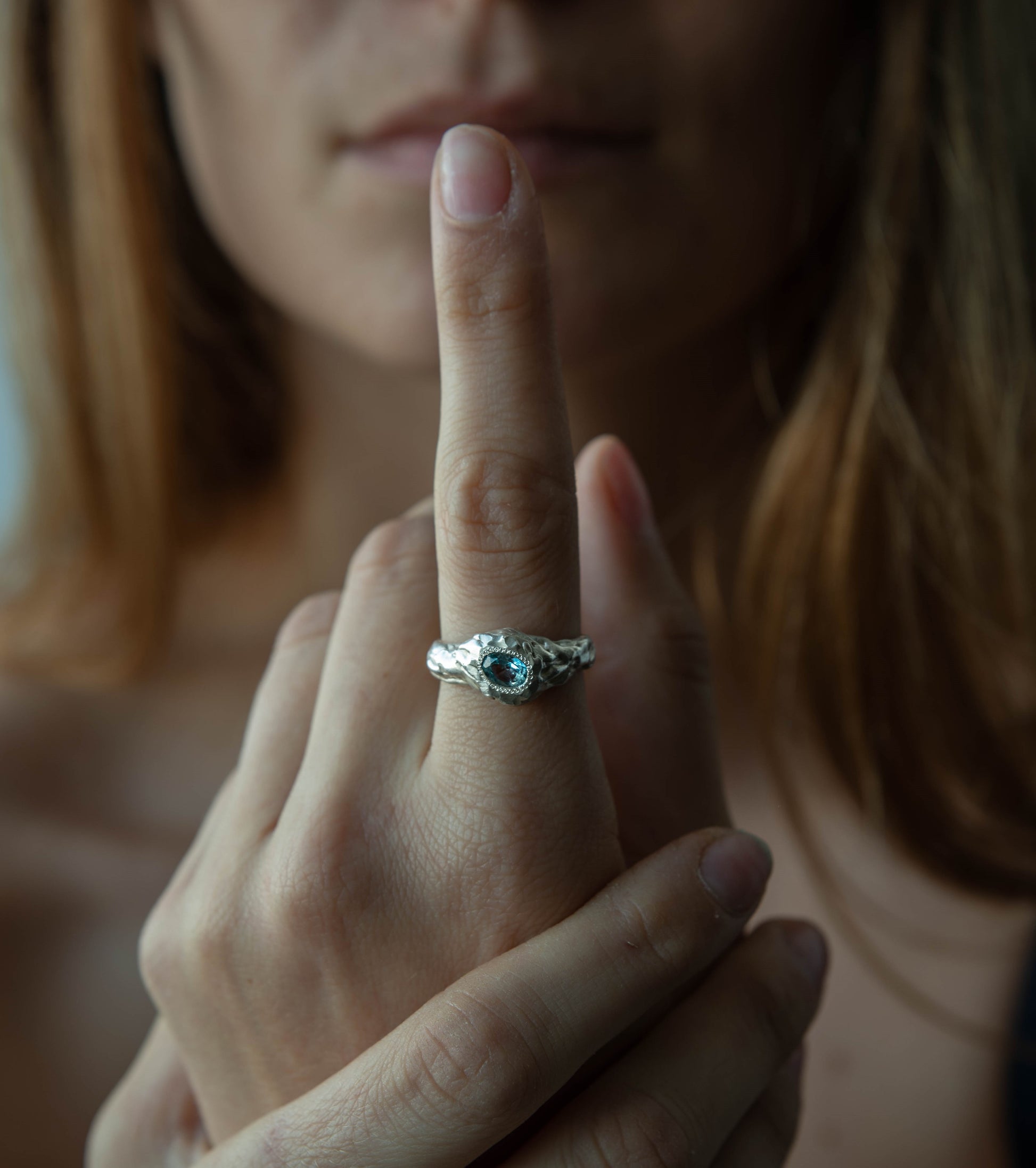 טבעת געש עשויה בעבודת יד מכסף 925 בטכניקת פיסול בשעווה.