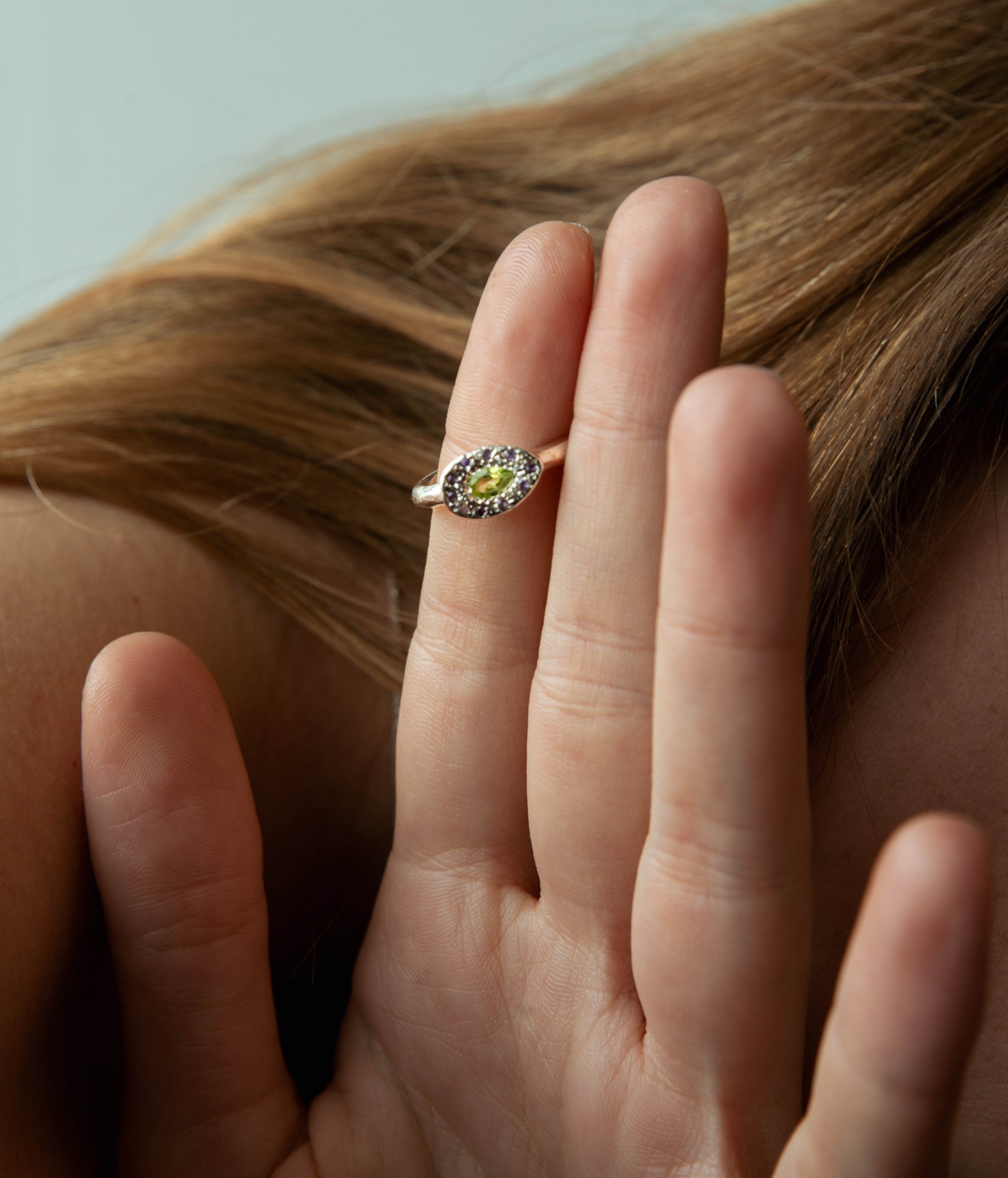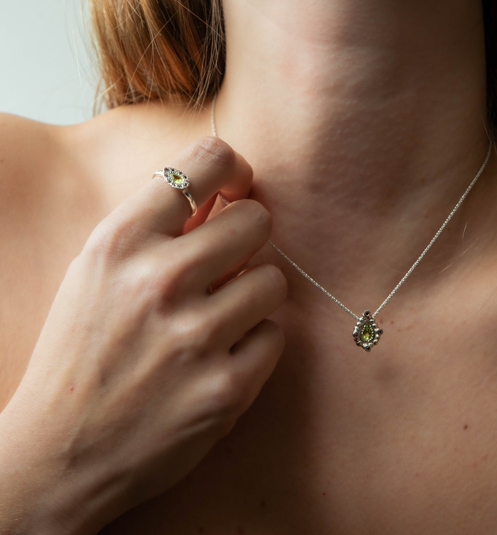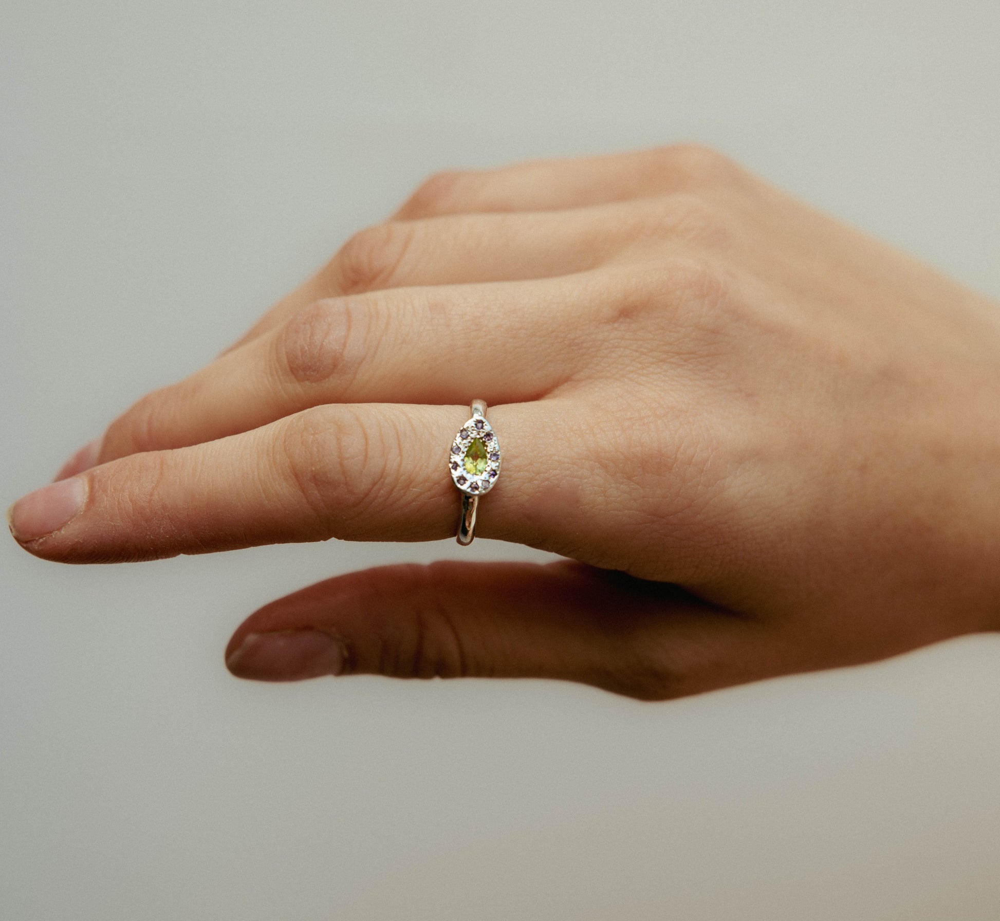 משובצת במרכזה בטיפת פרידוט ומסביב לטיפה משובצים אמטיסטים קטנים שעוטפים את הטיפה בשיבוץ כוכבים ונותנים לה מראה וינטג'