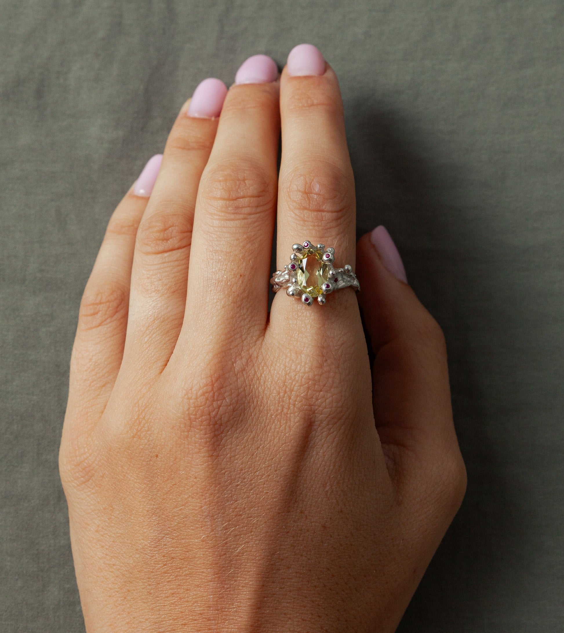 במרכז משובצת אבן למון קוורץ טבעית המגיעה אלינו מבנגקוק ובזרועות (שיניים בשפת הצורפות) משובצות רובינים טבעיות קטנות ובנוסף גם על השינה מכל צד משובצות שתי רובינים.