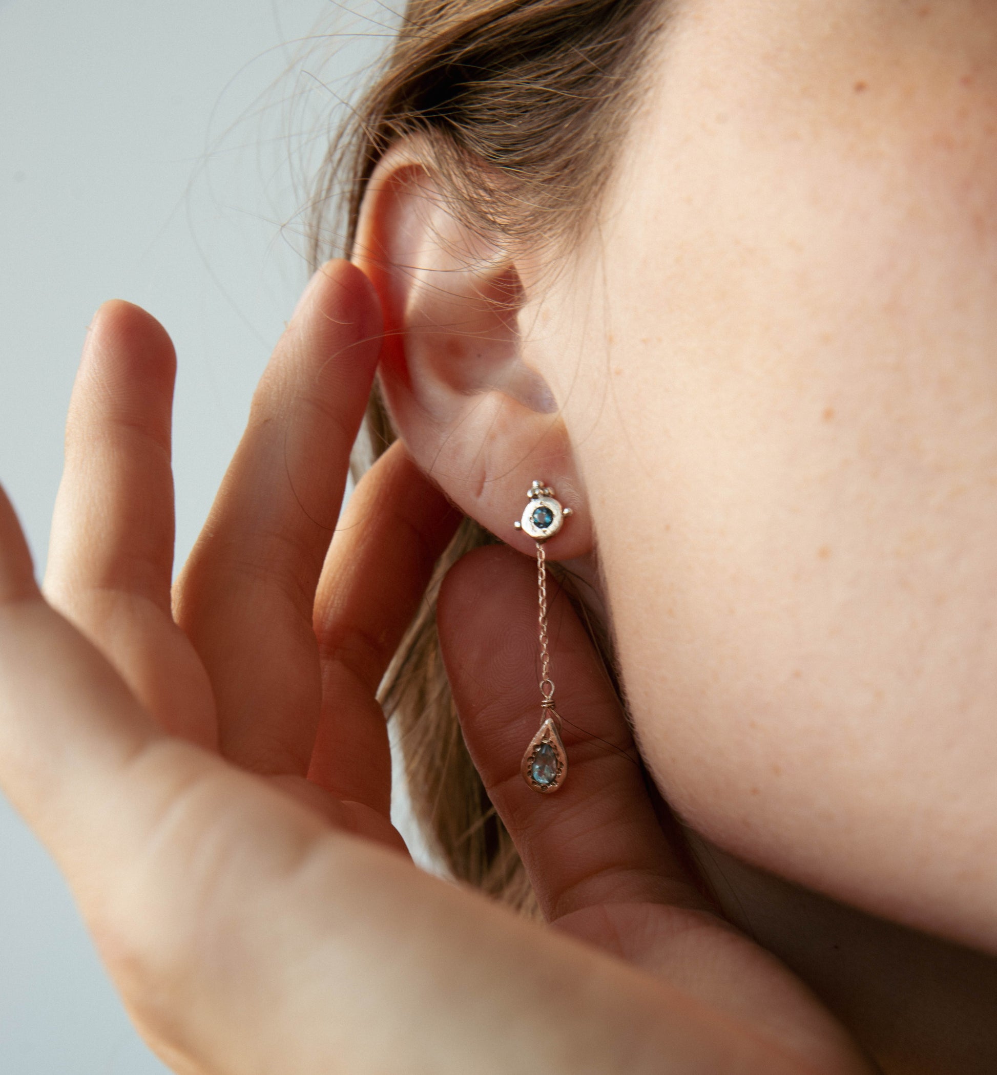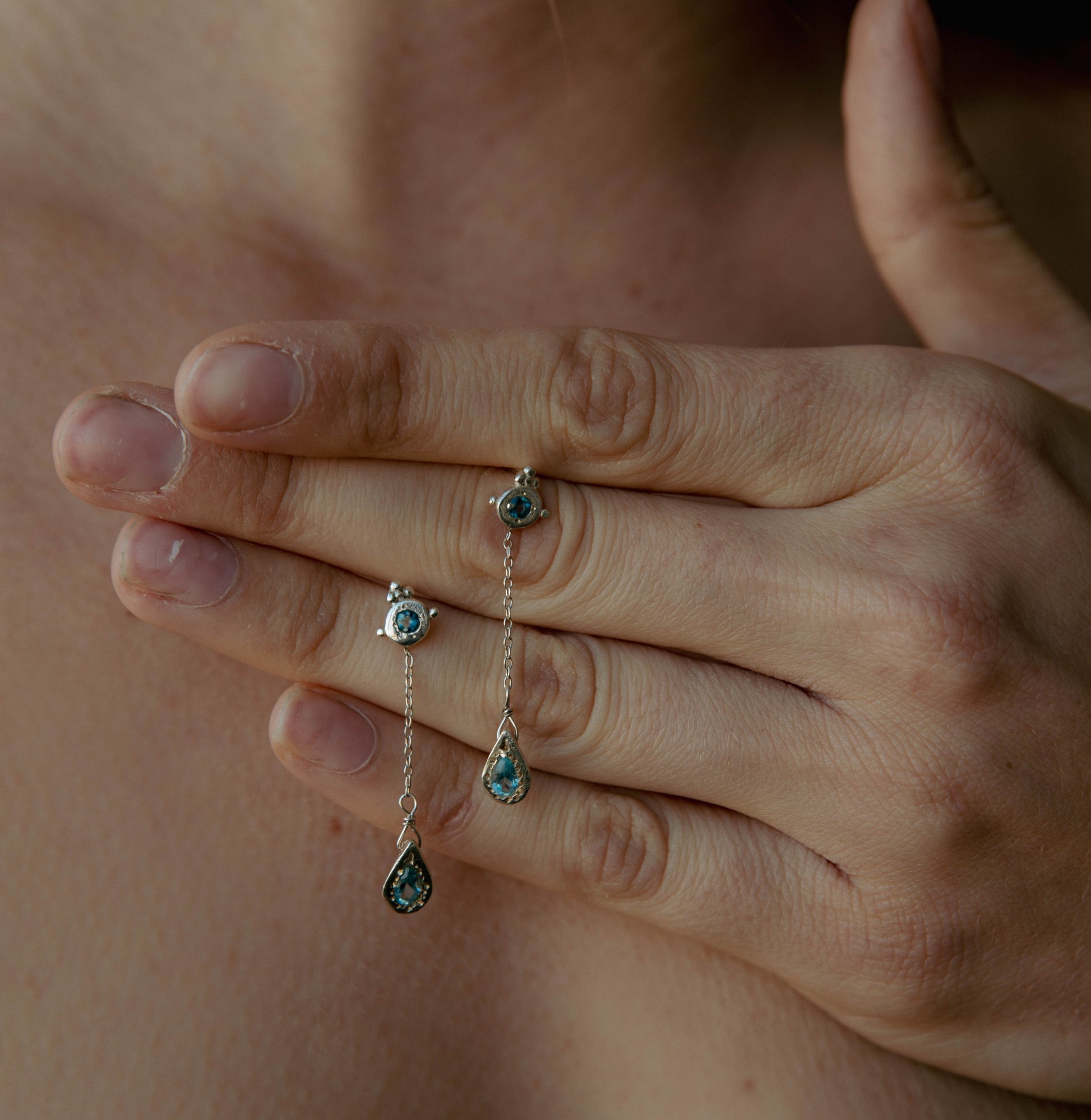 משובצים באבן חן בלו טופז לונדון (העיגול) ובלו טופז סוויס (הטיפה) ביניהם מחברת שרשרת עדינה ונותנת לעגיל להתנדנד בטבעיות על האוזן.