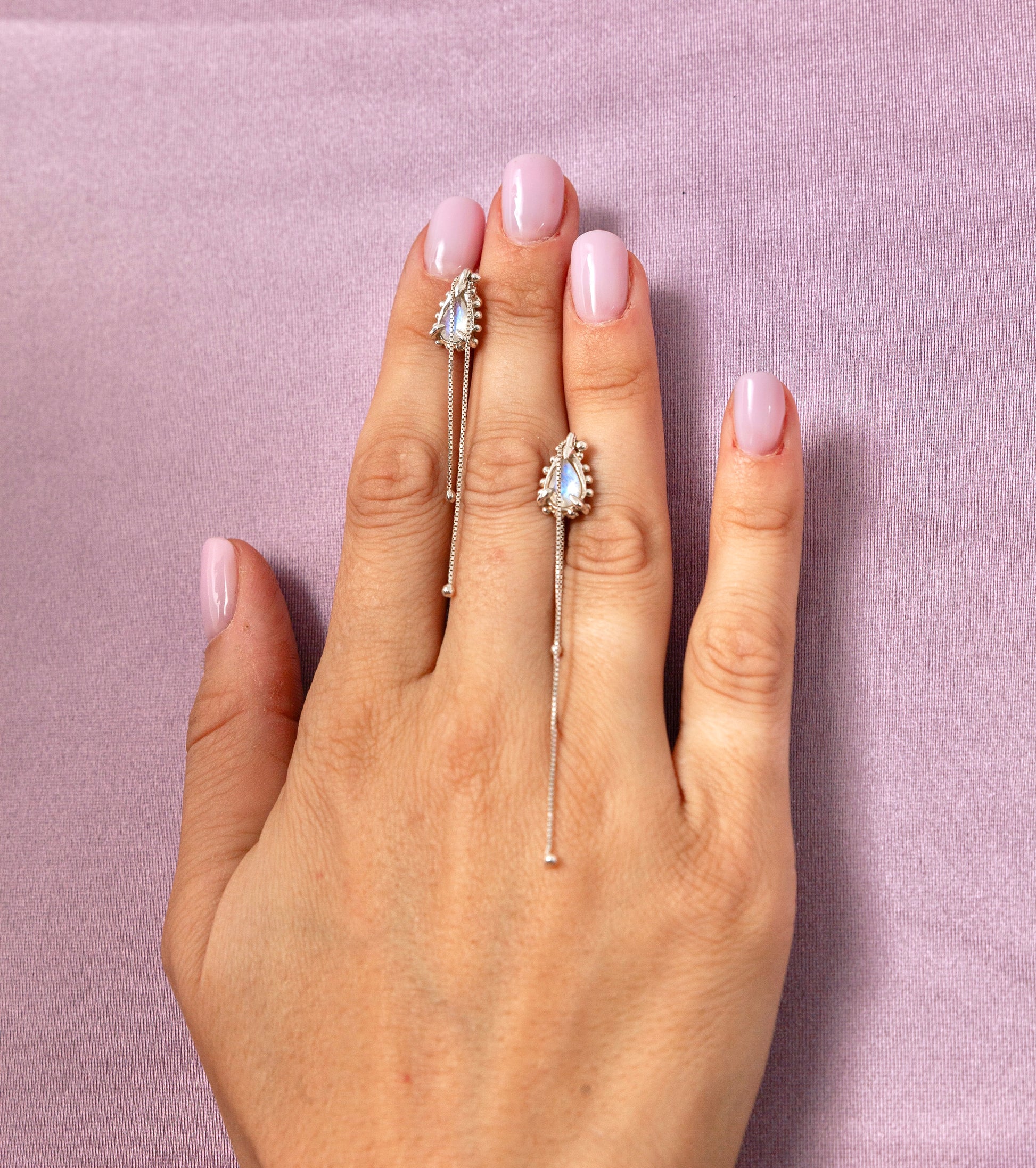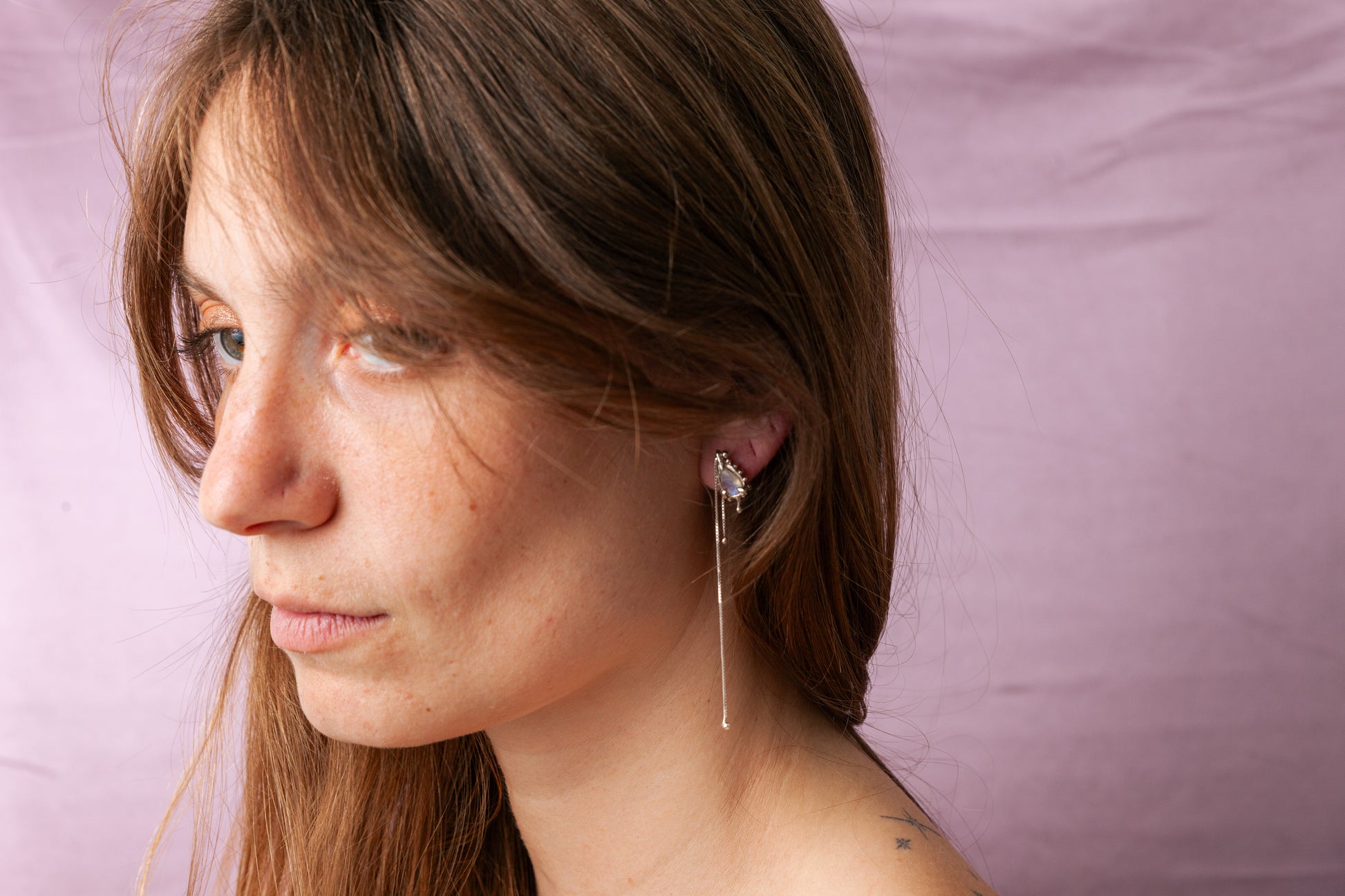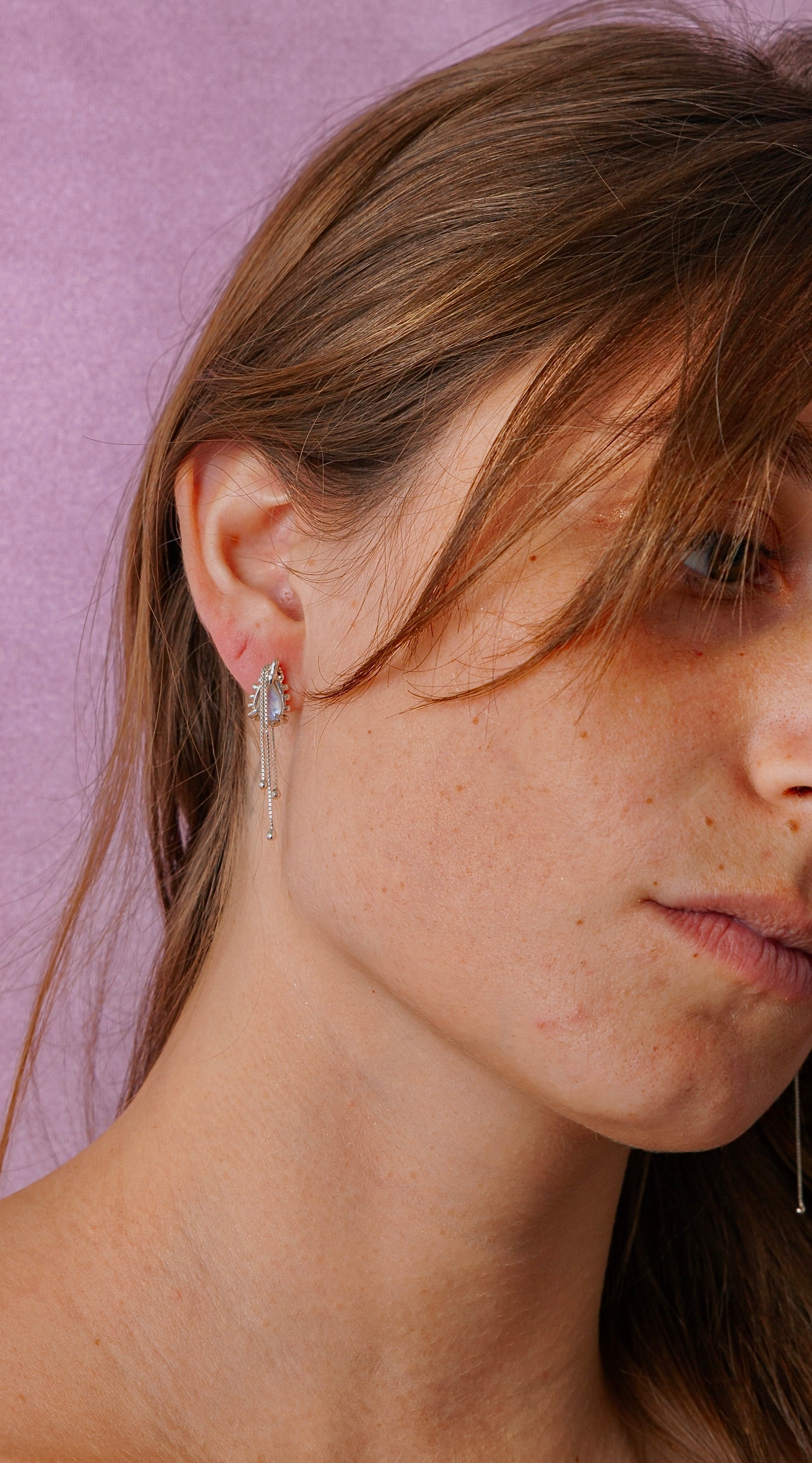 עגילי מדוזה עשויים בעבודת יד מכסף 925 , מעוטרים בנקודות מסביב לטיפת אבן חן המרכזית ומצורפת לכל עגיל 2 שרשראות המתנדנדות בעדינות על האוזן ונותנות אפקט של עגילים ארוכים.