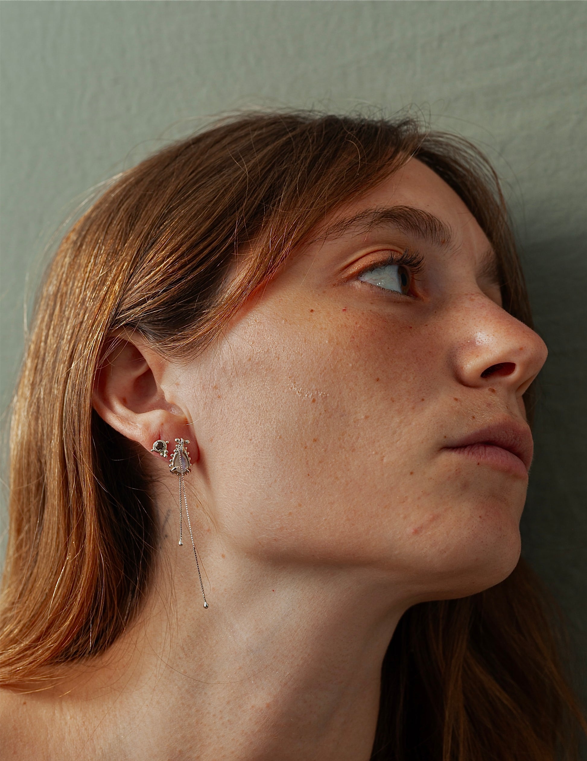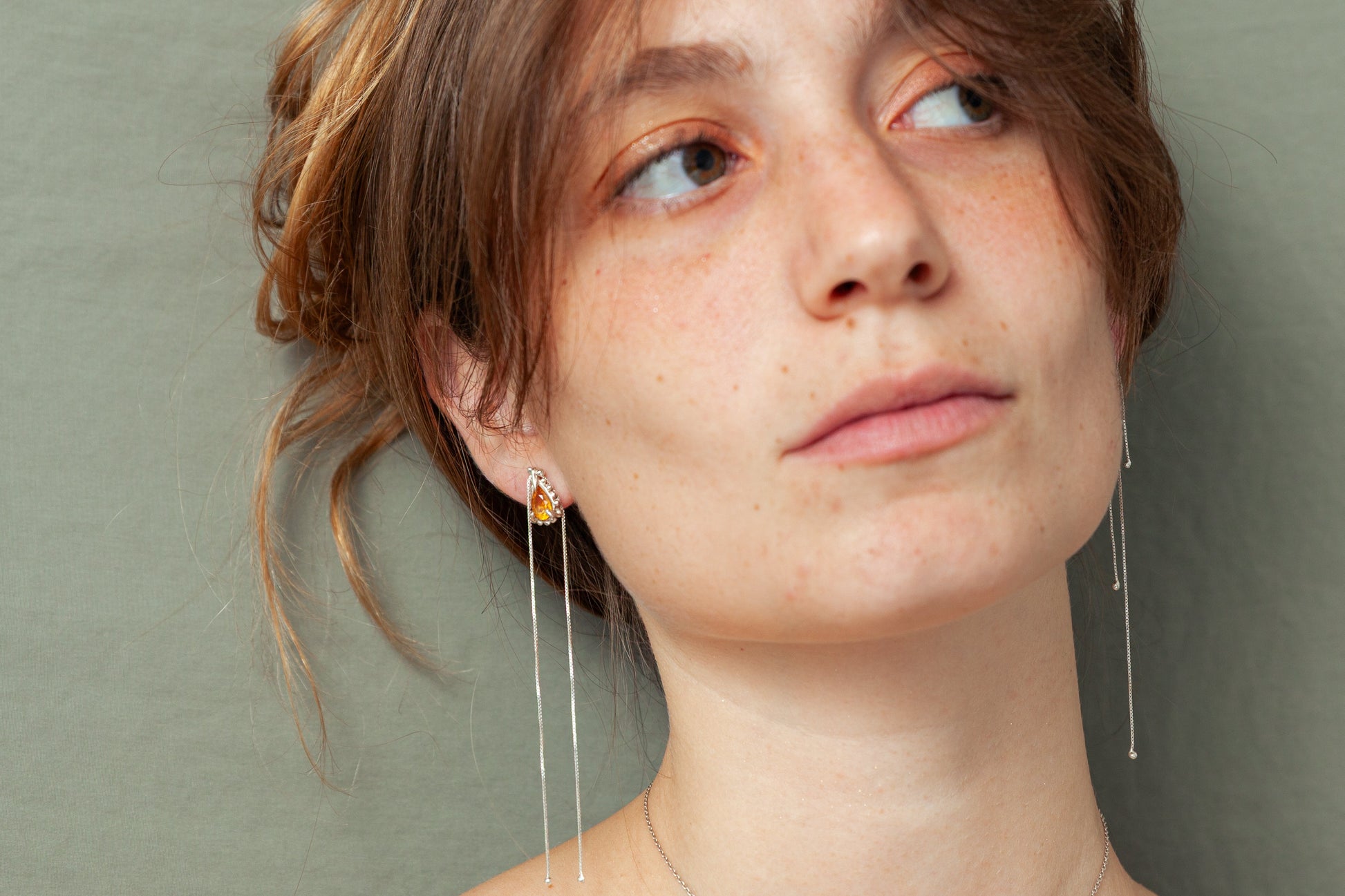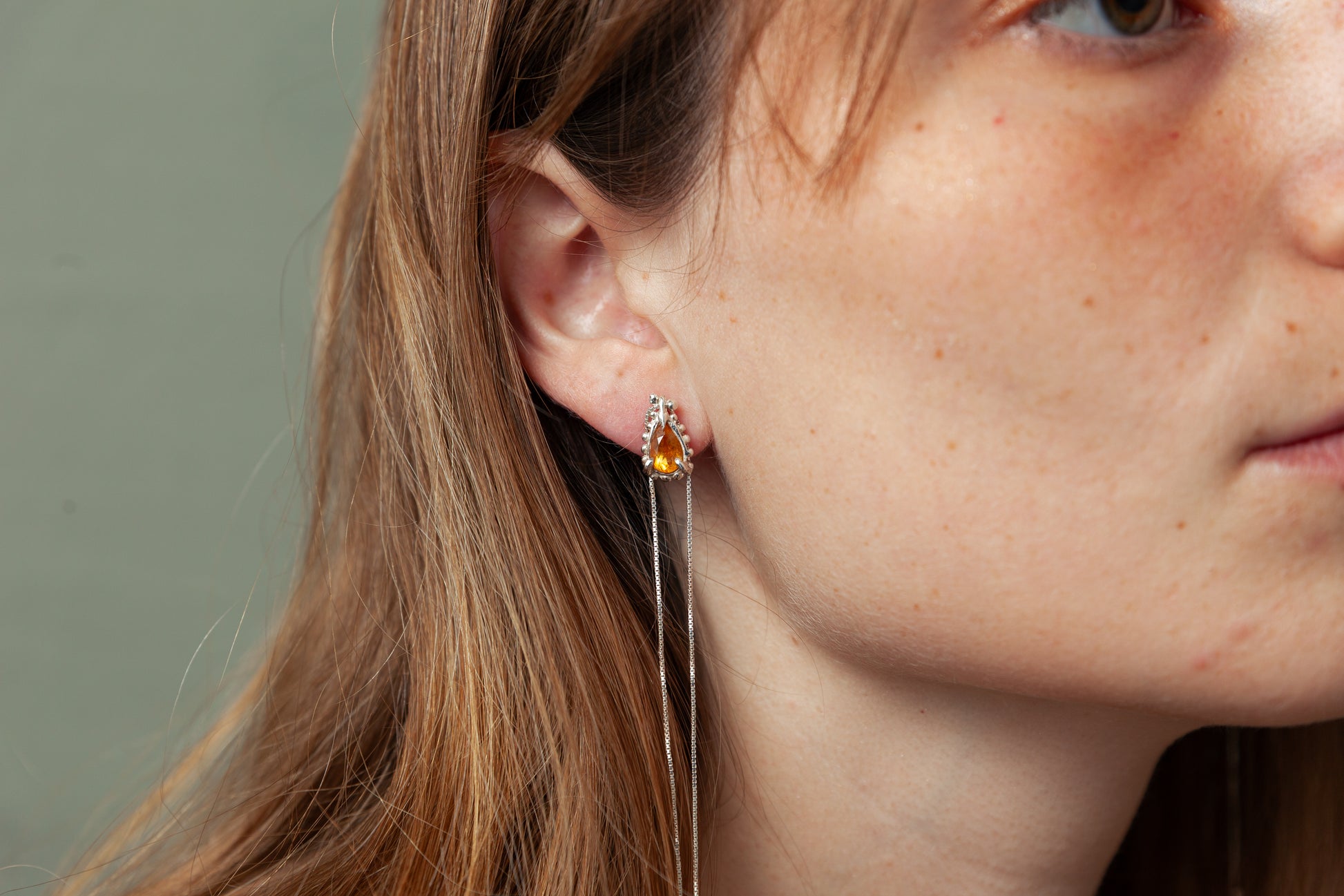 עגילי מדוזה עשויים בעבודת יד מכסף 925 , מעוטרים בנקודות מסביב לטיפת אבן חן המרכזית ומצורפת לכל עגיל 2 שרשראות המתנדנדות בעדינות על האוזן ונותנות אפקט של עגילים ארוכים.