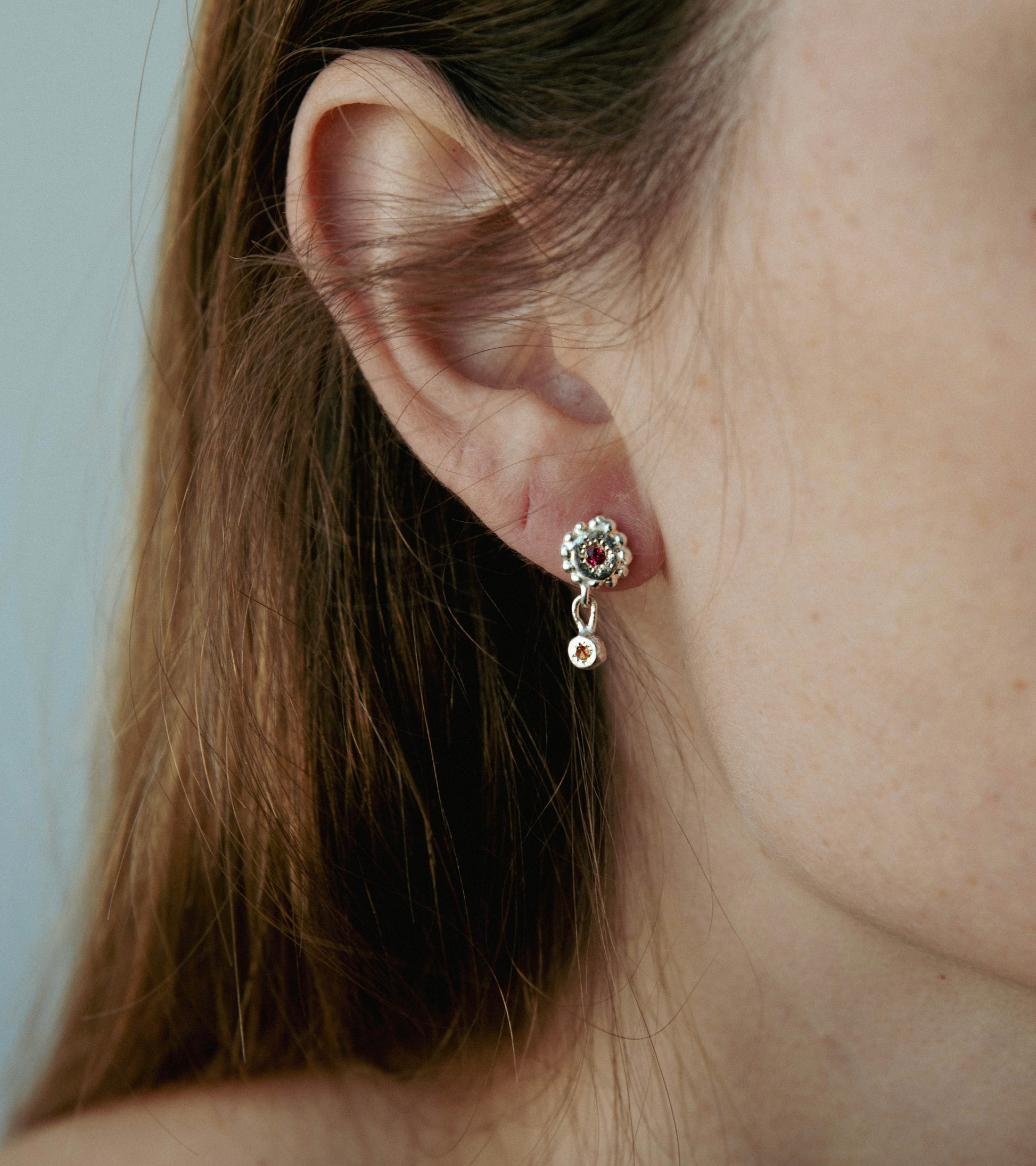 עגילי פונפונים עשויים בעבודת יד מכסף 925 צמודים לאוזן ומתאימים לחור ראשון שני ושלישי. משובצים בחלק העליון בטופז ורוד ובחלק התחתון בסיטרין מדרה. החלק התחתון מתנדנד בעדינות והעגילים עצמם קלים ולא צורכים משקל רב.