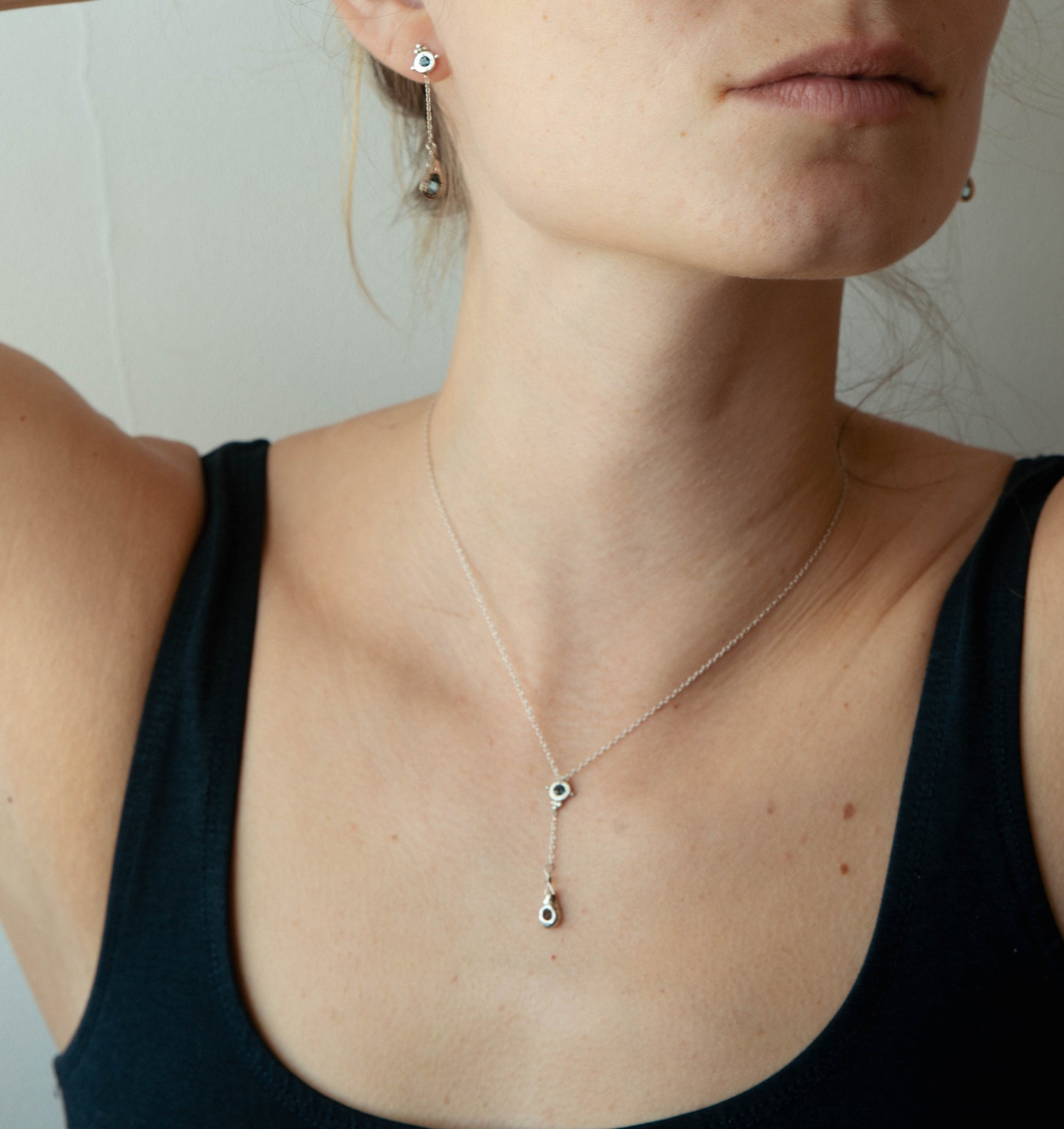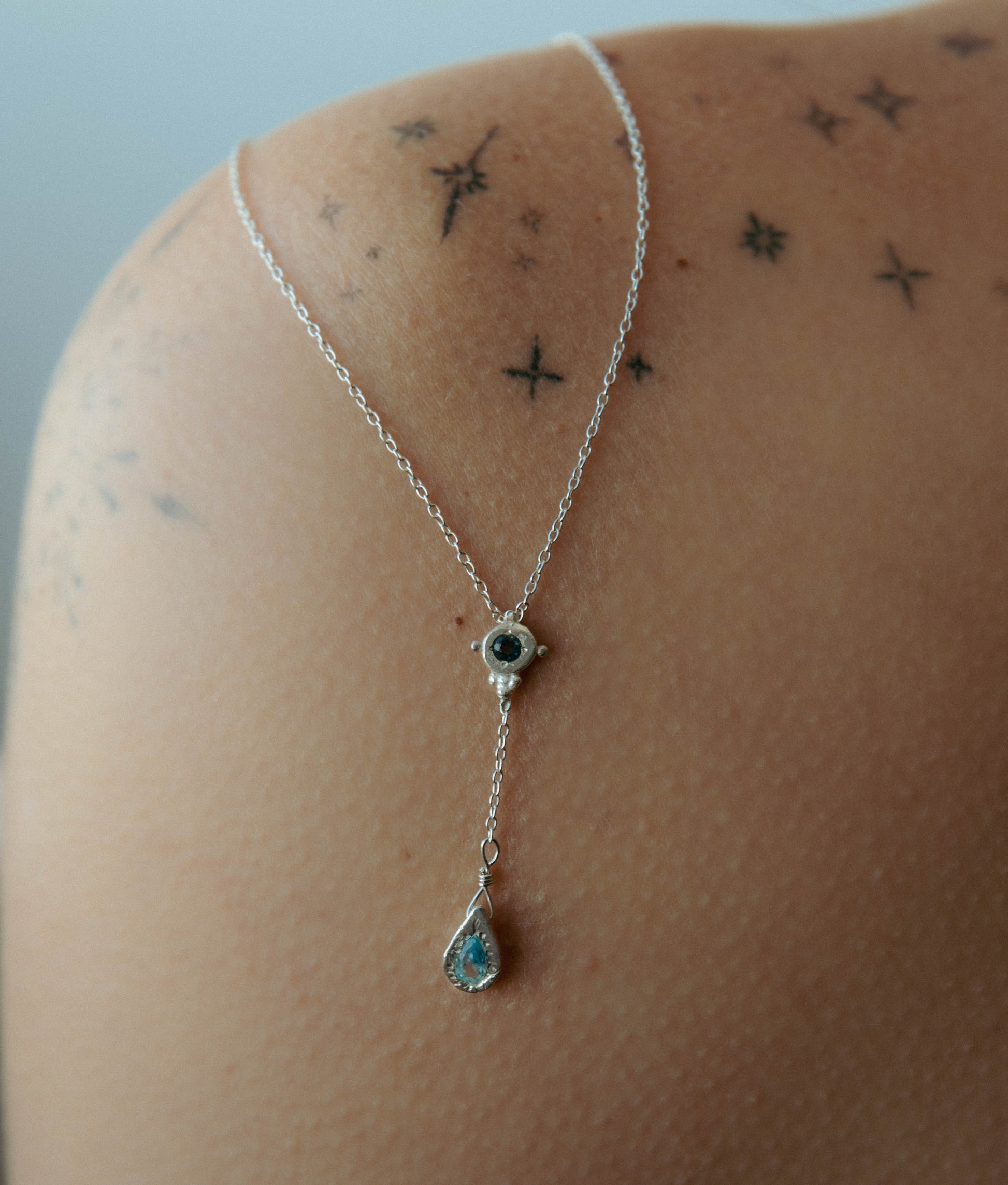 משובצת באבן חן בלו טופז לונדון (העיגול) ובלו טופז סוויס (הטיפה) ביניהם מחברת שרשרת עדינה ונותנת לשרשרת את האפקט העניבה על החזה.